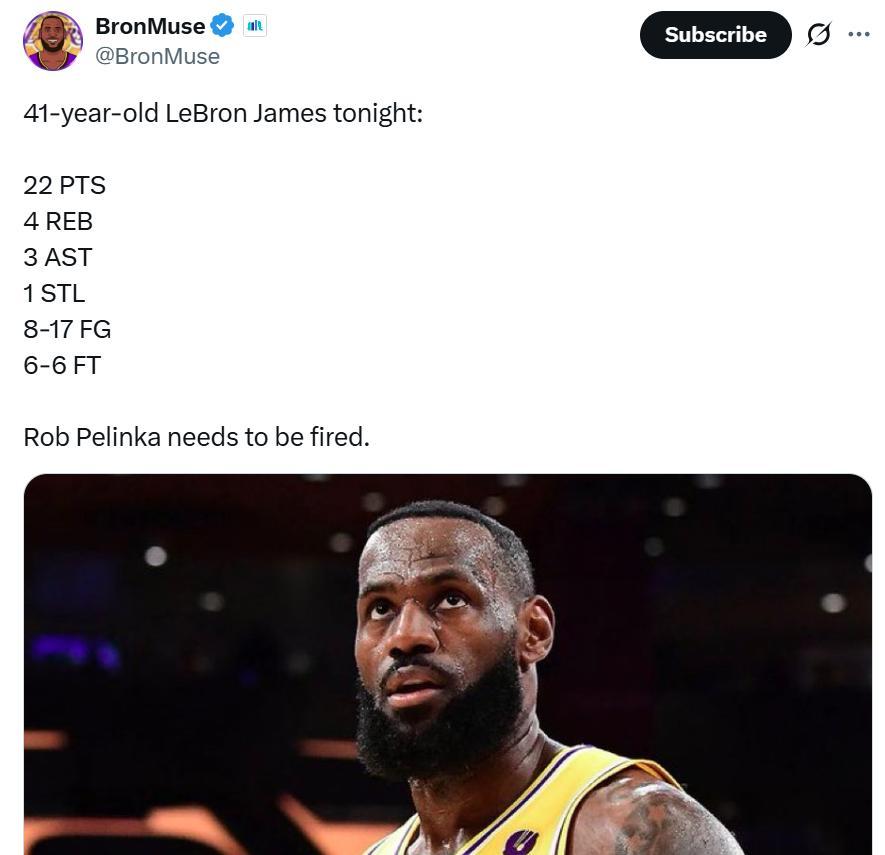 面对这样一场失利,赛后湖人媒体BronMuse晒出詹姆斯本场数据,17投8中拿下22分4板3助1抢断,并配文:“佩林卡该被炒鱿鱼了。”
